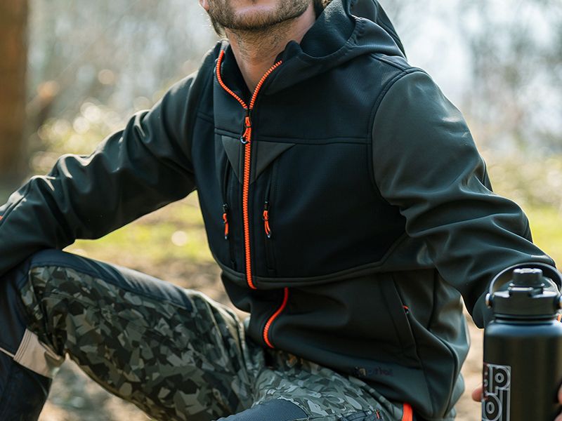 96 % poliester softshell, 4 % elastan 320 g/m2 zaštita od vjetra (WIND PROOF), zaštita od hladnoće (COLD PRROF) water repellent završna obrada tkanine ušivena kapuljača , unutrašnjost obložena fleece materijalom dva okomita džep na patent u visini grudi veliki cargo džepovi na patent u području zgloba sužena elastična manžeta koja sprječava ulaz hladnog zraka dodatna zaštita ispod patentna za smanjeni ulazak hladnog zraka