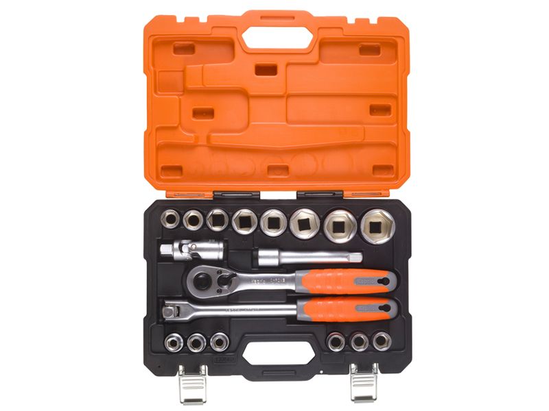 14 kom 1/2" nasadnih ključeva: 10,11,12,13,14,15,16,17,19,22,24,27,30,32 mm 1/2" produžetak 125 mm 1/2" ručka sa čegrtaljkom 1/2" adapter univerzalni zglobni 1/2" ručka sa zglobnim nastavkom ergonomski oblikovana ručka