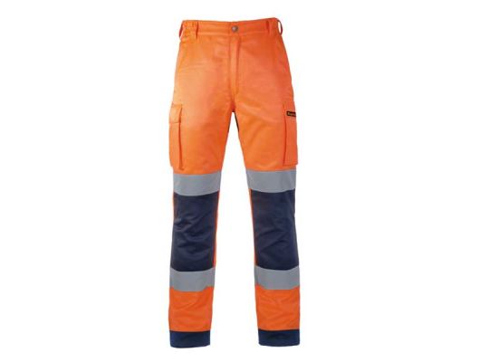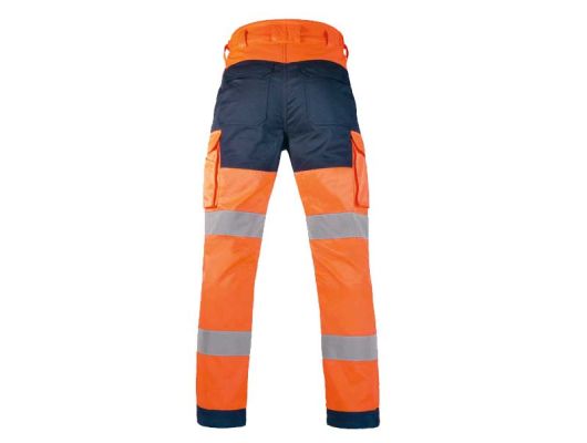 EN ISO 20471:2013 + A1:2016 visoka vidljivost glavna tkanina:60 % pamuk,40% poliester 240 g/m2 umetci / ojačanja: 65% poliester , 35 % pamuk 245 g/m2 regular fit tkanina otporna na kidanje i trošenje (wearproof) elastične u struku cargo džepovi iznad koljena dva zadnja džepa na preklop džepovi kosi standard HV trake 7 cm