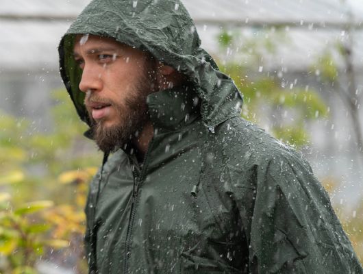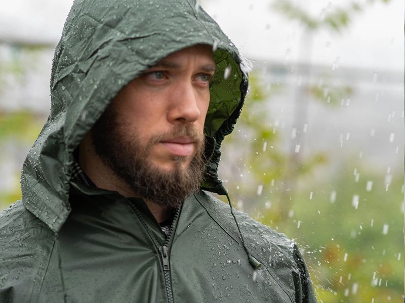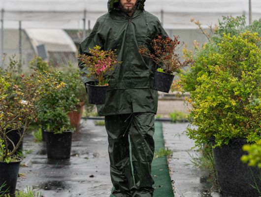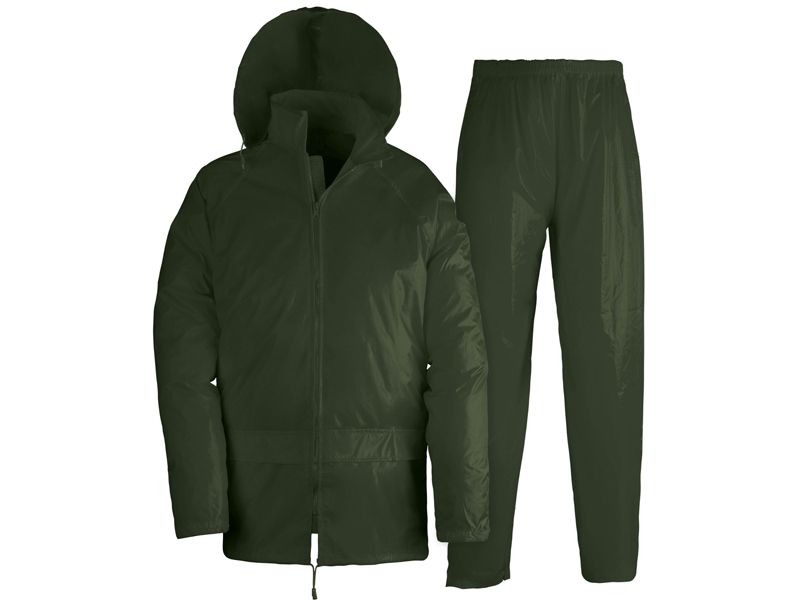 glavna tkanina: 65% PVC / 35% poliester kišno radno odijelo od robusne vodootporne tkanine kišna jakna ima velike džepove i kapuljaču koja se sklapa u ovratnik s džepom na patentni zatvarač podešavanje vezicom udobne vodootporne hlače širokog kroja vodootporna i prozračna završna obrada na poleđini i vanjska "vodoodbojna" završna obrada vodootporni patentni zatvarač šavovi prekriveni trakom